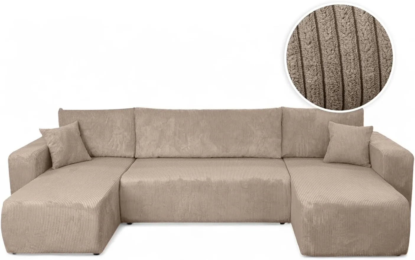 Ce canapé panoramique offre un espace généreux avec la possibilité de le transformer en lit d'appoint. Il est conçu pour accueillir confortablement jusqu'à cinq personnes. Sa structure en U permet de délimiter efficacement l'espace de votre salon. Le dossier est basculant pour faciliter sa conversion en couchage. Un coffre de rangement pratique se trouve sous l'assise principale, idéal pour organiser divers articles. Le revêtement en velours côtelé ajoute une touche esthétique avec une texture agréable au toucher. L'assise et le dossier sont composés de mousse pour un soutien adapté. La structure, faite de bois de pin et de panneaux de particules, assure une bonne stabilité. Ce modèle comprend également deux coussins pour un confort supplémentaire. Fabriqué en Europe, il représente une réalisation soignée.