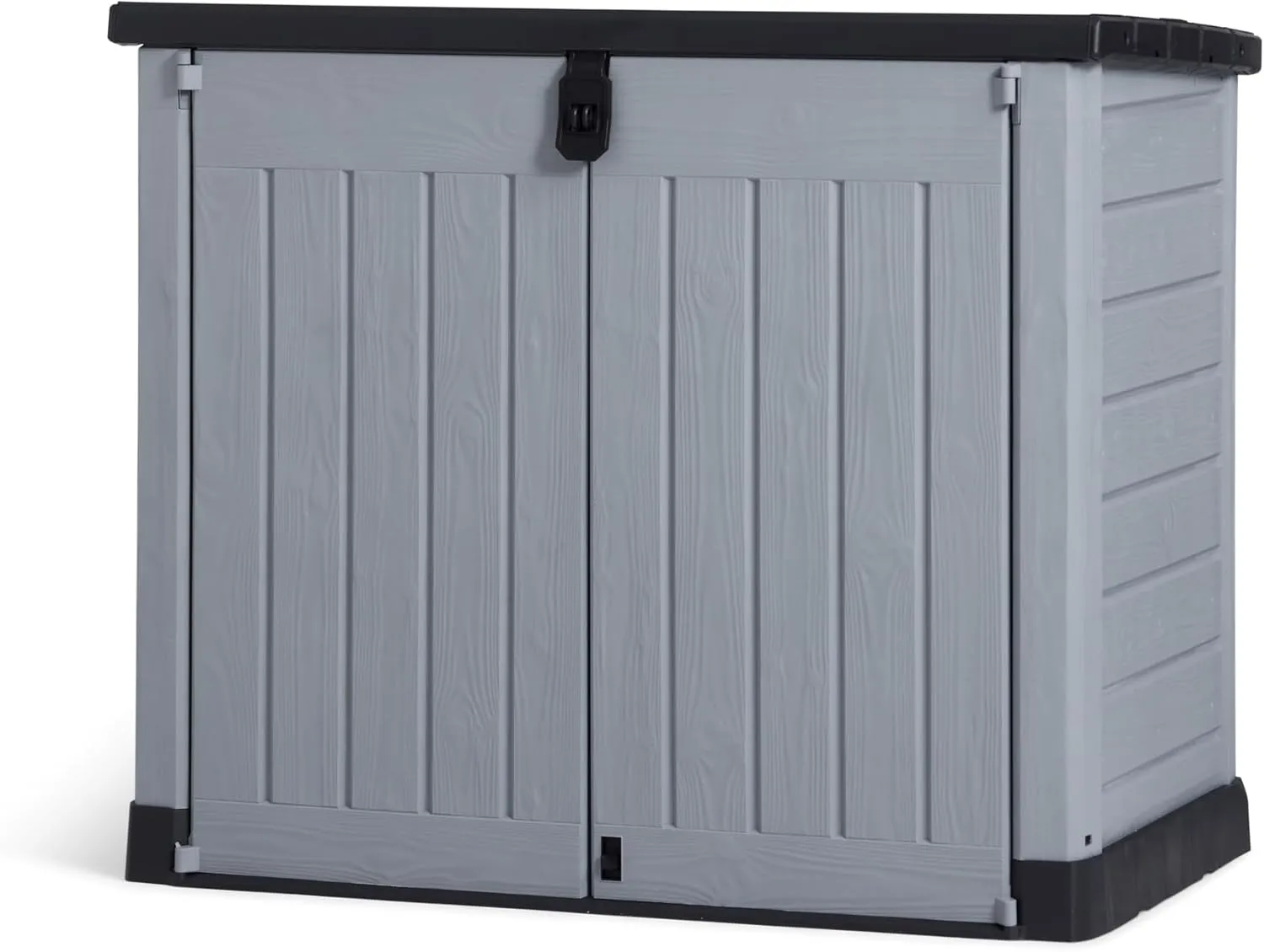 Capacité de 1200 litres Traitement anti UV Inclus : plancher Verrouillable Produit conçu pour le rangement et la protection d'outils de bricolage et de jardinage. Le coffre s'ouvre par le haut et par l'avant avec une double porte. Il est équipé de vérins pour faciliter l'ouverture. Le plancher est doté d'un seuil incliné pour le passage d'objets de grande taille avec roues. Peut contenir deux poubelles de 240 litres. Compatible avec des étagères (non incluses). Dimensions : L145,5 x P82 x H123 cm.