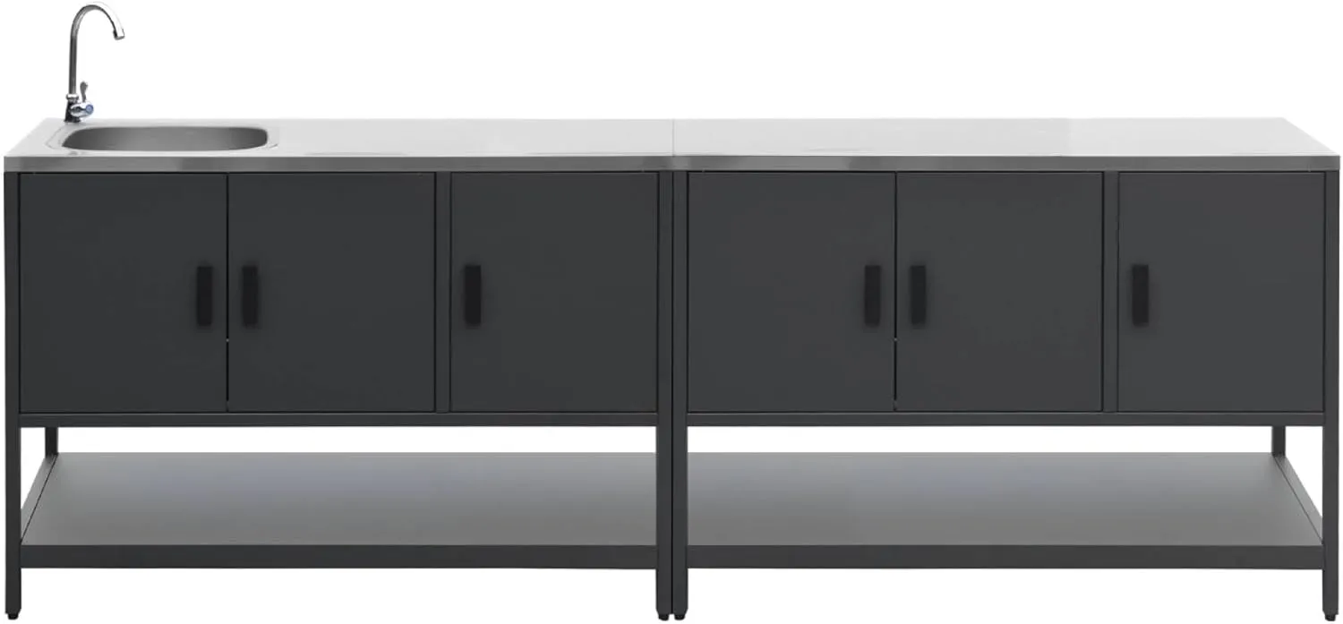 Cuisine extérieure avec modules en acier inoxydable. Comprend un évier intégré et un plan de travail spacieux, avec plusieurs espaces de rangement incluant 6 portes et grandes étagères. Compatible avec d'autres modules pour personnaliser votre espace extérieur selon vos besoins. Cette cuisine permet une organisation efficace des repas à l'extérieur.